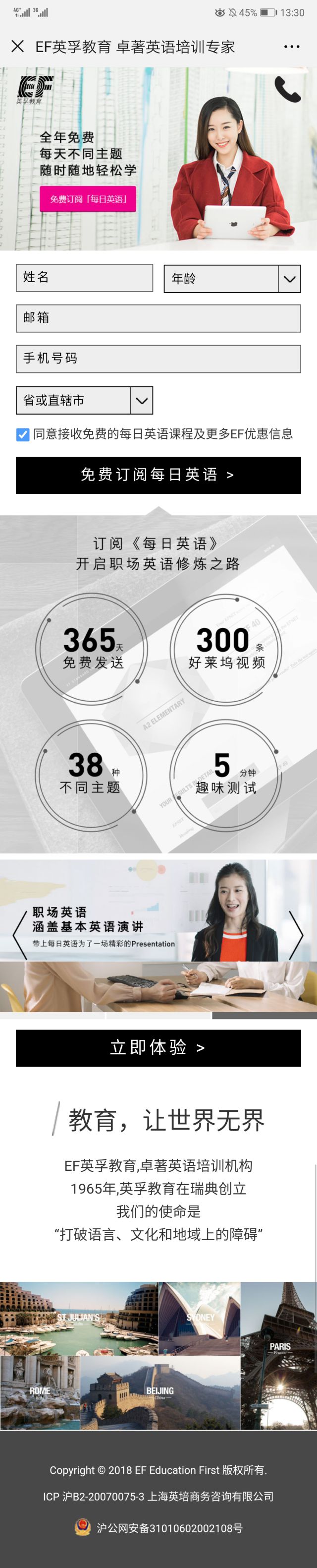 如果广告主们想要即表明自己的教育培训服务,有想要快速的完成自己的推广目标——收集客资,就可以在落地页开头就加入“表单”样式。 广告主可以填写自己的联系方式,就可以自己订阅“每日英语”课程。 在这之后,品牌广告主就跟大家展现了《每日英语》的优势:365天发送、300条好莱坞视频、38种不同主题、5分钟趣味测试等等。 广告落地页在往下方就是英孚教育的品牌介绍和分布城市的组图!