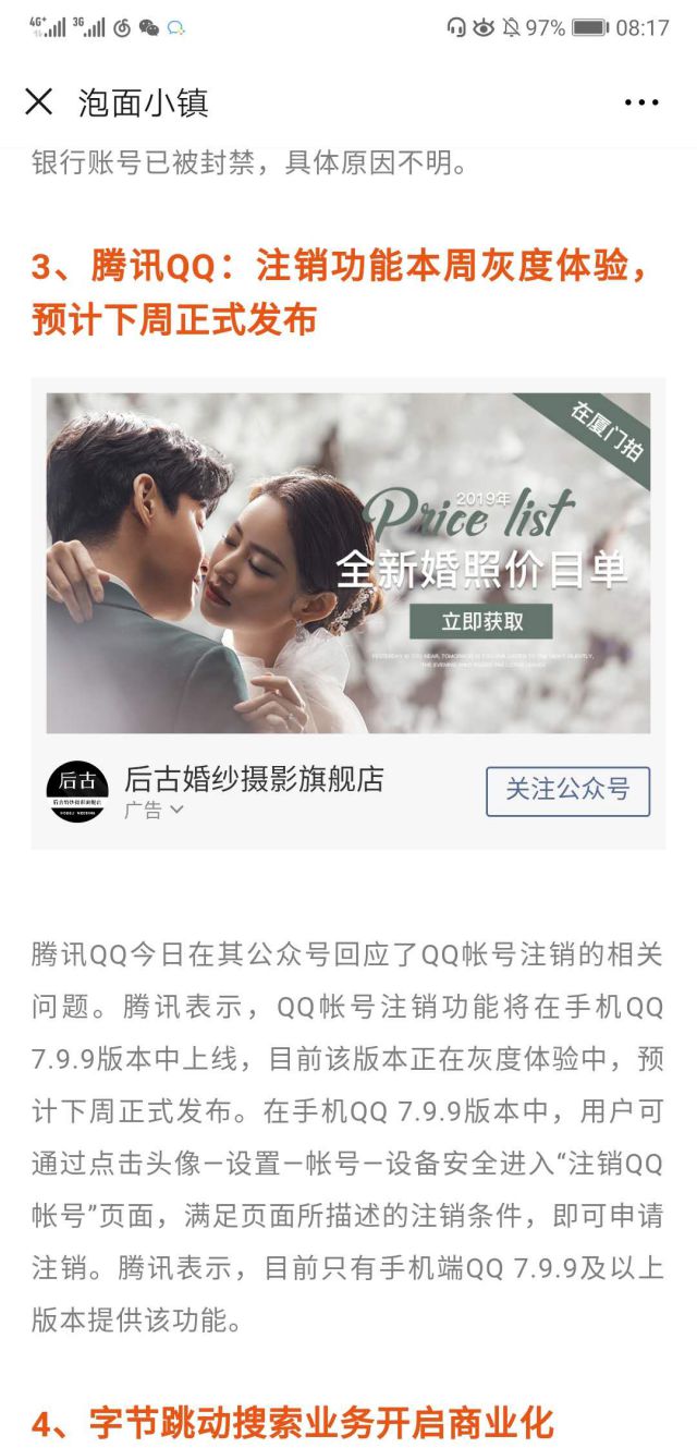 这开发的网站里的案例分享就是后古婚纱摄影投放的公众号广告,广告以卡片的形式展现在微信公众号文章中间。 用户在拍摄婚纱照过程中,最在乎的一个是价格问题,还有一个就是价格问题,而这里的卡片广告整合就觉了用户的疑虑,如果你对成品有顾虑,相信你也能够看到这里的广告图片也能够看到企业的拍摄和后期处理技术,对于价格问题在广告图片中也有所体现,如果想要了解具体的价格,可以点击广告获取全新婚照价目单,并且在右上角的市场营销精准地方还有文字“在厦门拍”等等,这里的文字可以随意替换,也可能是固定不变的,在婚纱摄影行业,在不同的地方拍摄不同的婚纱照,价格也是不一样的! 点击卡片广告中的“立即获取”和“关注公众号”都会进入广告主的推广链接,也就是后古婚纱摄影公众号详情页。