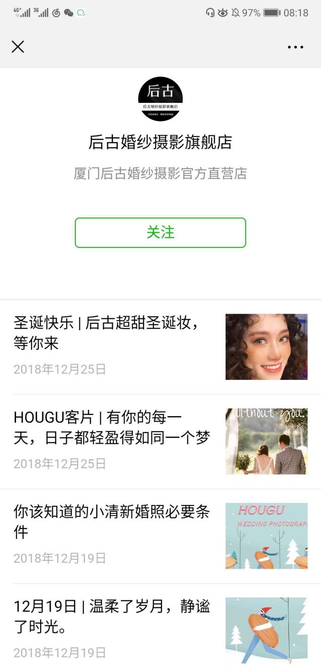 在这一页面中,我们能够看到的内容就是公众号的历史推送消息,还有公众号的“关注”按钮。到了这一页面之后,用户能够和广告主产生的互动即为:点击“关注”按钮,即可关注后古摄影的官方公众号! 我们在通过投放微信公众号广告投放婚纱摄影行业的广告时,需要找准自己的推广目标,随后就是需要找准推广亮点,比如自己提供的优质服务,或专业网络公关是价格优势等等。