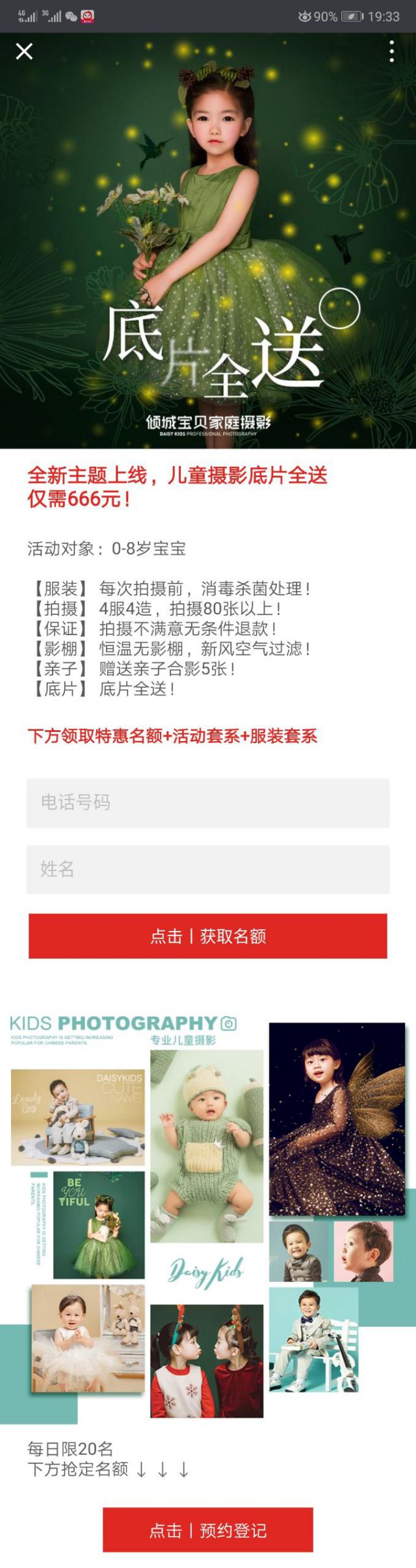 我们可以将广告落地页总结为两大部分内容:一部分是将倾城宝贝能够提供的儿童摄影服务,活动对象以及表单形式,用户需要填写表单以后,才能领取优惠名额,这一内容也是提升广告转化率的重要内容;还有一部分内容就是样片展现,样片的展现则是向用户做了品质保证、技术展现,以及倾城儿童摄影能够提供的儿童摄影的风格套系等内容。 儿童摄影在做微信朋友圈广告投放时,除了能够推广优惠活动以外,我们还可以以报价的形式、公关危机第六季或是抽奖转盘来收集有效客资! 如果你有关于儿童摄影投放微信朋友圈广告创意,也可以联系我们来进行创意试投放!