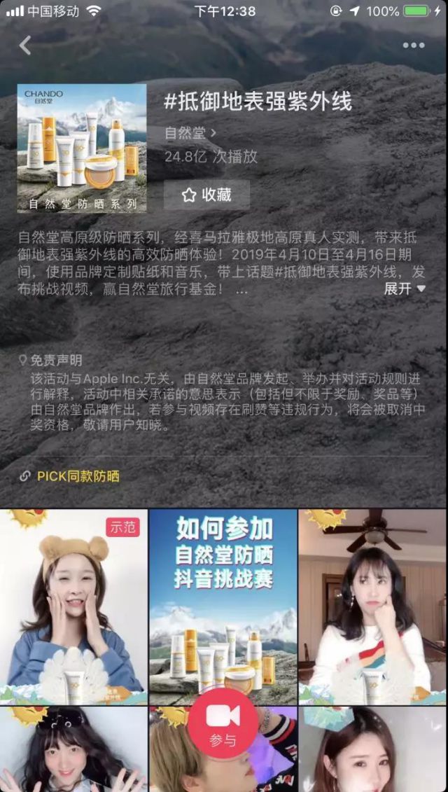 抖音超级挑战赛,一般来说长于品牌曝光。而此次挑战赛,有效中和了这一状况——在视频播放的过程中,自然堂不同的防晒产品也收获了较好的曝光。 24亿次播放量带来的,是更多潜在用户对产品的认可和认知。 奖品设置:场景相关设置,体现功能自信 本次由自然堂发起的抖音超级挑战赛,在奖品设计上也做了较好的场景相关:3000元旅行基金+高原级防晒系列全部8支产品,既充分调动了用户参与的热情,也潜在传达了全部8支产品在生活场景中的应用。 在营销内容碎片化的当前,如何依靠最小单位的UGC做传播,成为每一个口碑过硬的产品必须在营销中认真思考的问题。自然堂#抵御地表强紫外线#超级挑战赛,充分结合抖音平台的内容特性——互动性强、积极性高、用户愿意积极展示自我——撬动了有效的UGC,成为自己产品的坚实背书。