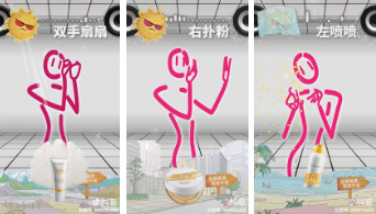 自然堂从游戏中获得灵感,设计了“抵御紫外线”的贴纸玩法:用户通过伸出手掌这一手势,可接连触发3种不同的产品出现,抵御来自屏幕左上角的紫外线。 手绘风格贴纸+用户真实拍摄,将产品“防晒”的“抵御”功能在互动游戏中淋漓尽致地表达了出来。 户外防晒技能——自然堂羽感致护防晒SPF50+ PA+++,高倍轻薄,化身天使吹走太阳 城市防晒技能——自然堂轻薄水润修颜气垫防晒SPA50+ PA+++,高倍修颜,变身武器切开太阳 旅行防晒技能——自然堂冰爽清透防晒喷雾SPF45 PA+++,清凉修护,能冰冻住太阳并将之击碎