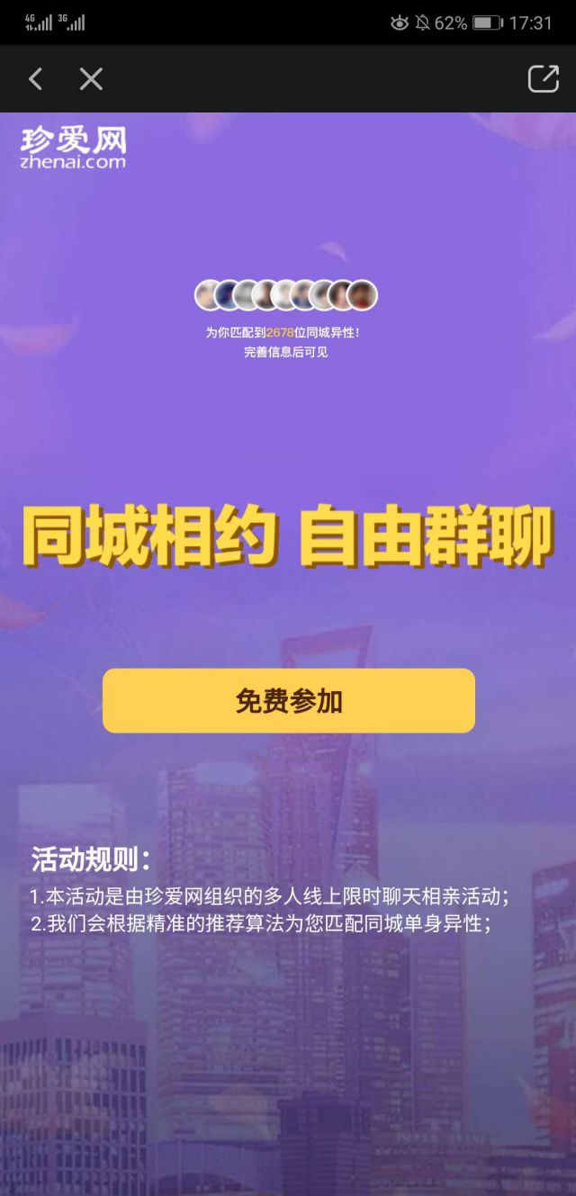 广告落地页展示 看到广告主落地页的内容,我们就可以明白广告主实际上是要推广由珍爱网组织的“同城相约,自由群聊”的活动,大家点击按钮“免费参加”即可参与活动! 并且在广告落地页中,可以看到参加活动的人数,也可以额看到活动规则,在活动规则中所提到的“推荐算法&rdquo大客户营销推广;也是突出珍爱网是采取“网络征选+智能推荐+人工红娘”的形式来为大家推荐另一半的! 以上就是珍爱网投放的爱奇艺广告,我们在通过爱奇艺广告推广活动时,我们同样需要站在用户的角度,深挖用户痛点,根据用户痛点来设计相应的营销活动,并通过一些有趣的广告文案来进行内容的宣传!