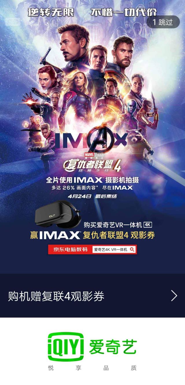 广告主选择的是爱奇艺开屏广告,爱奇艺开屏广告开机即全屏100%展现,广告形式支持3-5秒的静动态图片,广告内容展现5秒后即可跳过,用户点击手机屏幕任意界面,都会进入广告主的推广链接中,在用户点击“跳过”时,也会不小心点击广b站信息流广告告界面,并进入广告落地页中。 广告主的配图是《复仇者联盟4》的海报,虽然有海报内容,但是也有关于广告主推广产品的简单描述,比如“《复仇者联盟4》全篇使用IMAX摄影拍摄,多达26%画面内容尽在IMAX”。 广告主主要的推广聂荣就是爱奇艺VR一体机,如果是在一般的场景下推广VR一体机可能效果不是很大,但是通过在《复仇者联盟4》播出的时候推出,就会让VR一体机的销量翻番,并且广告主为了能够吸引有用户点击广告,还有表明说“购买爱奇艺VR一体机,可赢IMAX复仇者联盟4观影券”,通过购买产品能够赢得电影片对于用户来说也是一大福利! 在广告展现期间,也有给用户讲述产品的购买流程:用户可以通过广告展现来进行产品购买,也可通过在京东搜索框内输入“爱奇艺4KVR一体机”找到产品,并进行购买。 点击广告,我们看到的广告落地页是这样的~