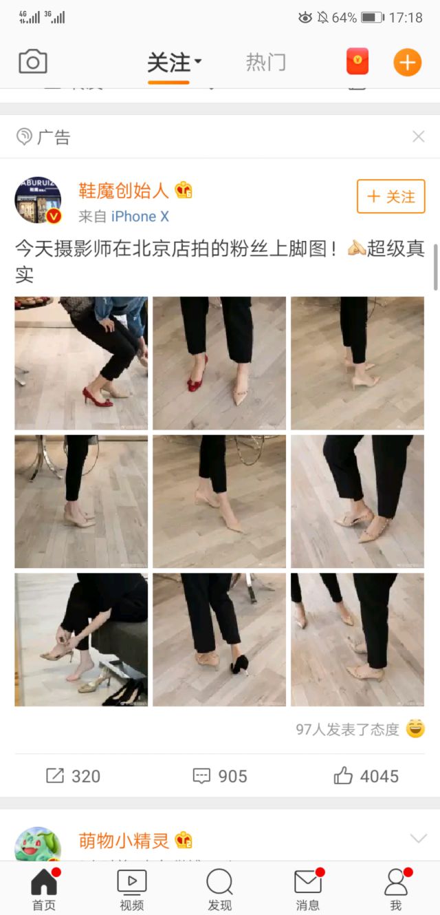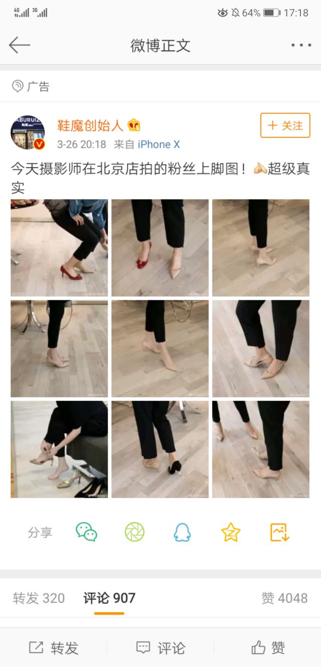 讲真的,广告主的微博账号名称还是很魔性的,但是这类的广告案例都很吸引用户关注,也能给用户比较深刻的印象! 广告外层文案展现就是如上图所示,用户能够看到的内容如图所示,通过广告文案广告主可以看到文案以及九宫格的图片,而图片就是真人上脚图,在看到这里的广告内容,看起来还是比较好看的。 而广告主这里的广告文案内容也就是宣传自己的鞋子细节图~ 二、广告落地页