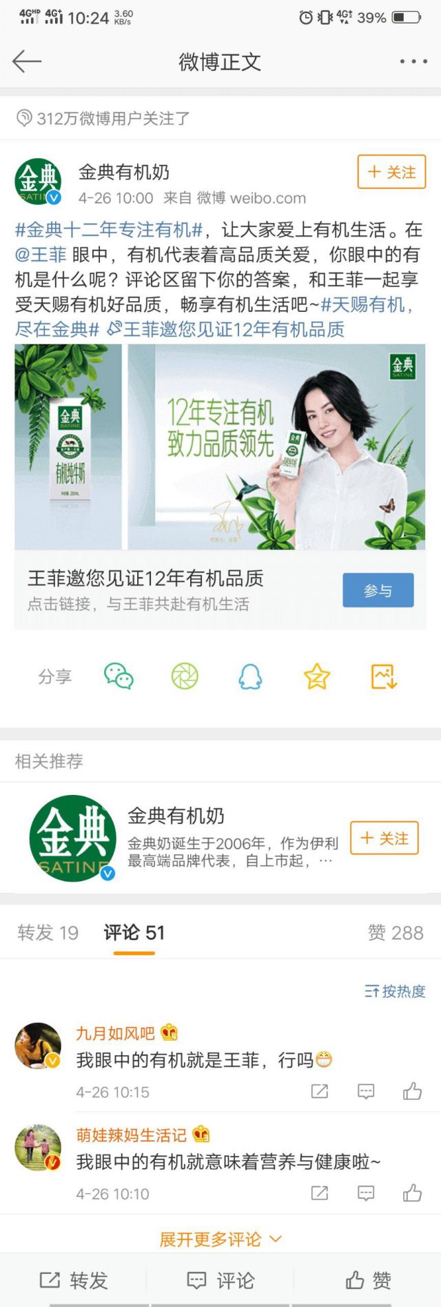 除了电视上的赞助之外,金典更是无时无刻不出现在微博里面,加上话题,更有王菲代言。“天赐良机,尽在金典”,在微博上,光是属于金典的话题也不少低价引流是什么哦~ 再加上一些品牌活动,结合明星效应,那结果简直不要太好!更是有网友在广告的下方参与互动,可以说,金典的品牌形象已经走进了千家万户。 在老家的时候,亲戚朋友过节送礼,都会少不了一箱金典,金典无处不在~ 有多大的投入新宁夏宣传片就会有多大的回报,金典就是一个典型的例子,从《歌手》开播以来,一直赞助,从未间断,而在微博与用户的互动广告也是从未停止,每天都有新广告,每日都有新内容。投入和回报成正比,只要你敢拼敢试敢投入,那就一定会有所回报!