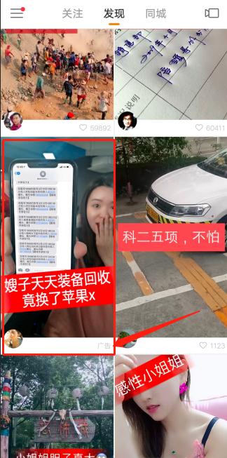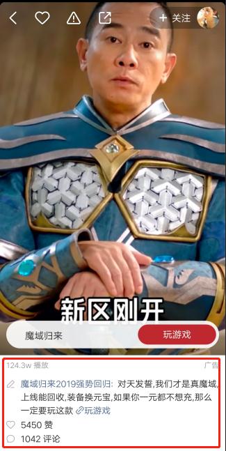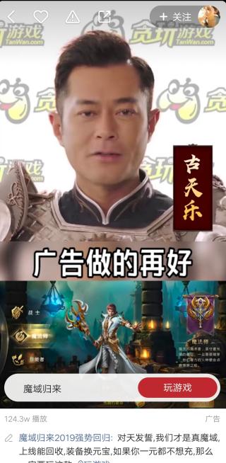 在刷快手视频的时候,我们可以看一下,一般进入快手视频看到的第5条内容就是一条广告,而这些广告播放量不亚于普通的热门视频,例如《魔域归来》,视频的封面很普通,表现得比较震惊,而且右图有真相,用“苹果X”吸引用户的点击。点击进去之后就是游戏的讲述,并且插入由3个明星讲解的视频内容,吸引用户,这可以说是一条阵容很强的游戏广告了,代言人:古天乐、陈小春、马丽。这么强的阵容广告怎么会不火?
