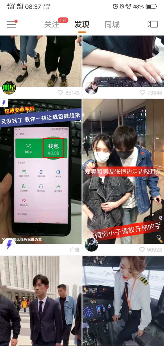 快手广告一般展现在打开快手之后“发现”页的第5条视频,也就是第三行第一个,这时用户刚打开APP开始看视频,是兴趣最浓的时候,也不会对用户产生干扰,因此对用户的接受度很高,用户体验也是没得说。 这则广告是一款赚钱型的APP,对用户吸引比较大,利用“赚钱”的形式推广APP最成功的案例当数,自身给用户一个体验的噱头,打动用户才能更好的推广,再再用户比较多的平台进行广告投放,大力宣传,还怕找不到用户吗?只要广告做的好,转化都往囊中跑~