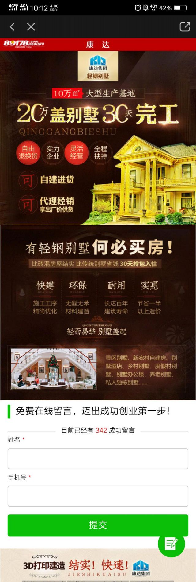 落地页: 点击进入广告之后,进入到广告的落地页,落地页说轻钢别墅的优点以及轻装别墅可以建造哪些类型的别墅,下方有表单,有意向的用户可以填写表单参与报名,丧文化用户填写表单的同时就代表了广告主收集了一条客资,后台可以统计收集到的客资,方便广告主对用户维护咨询,提高转化。一个好的落地页是广告主留住用户实现转化最重要的一步。