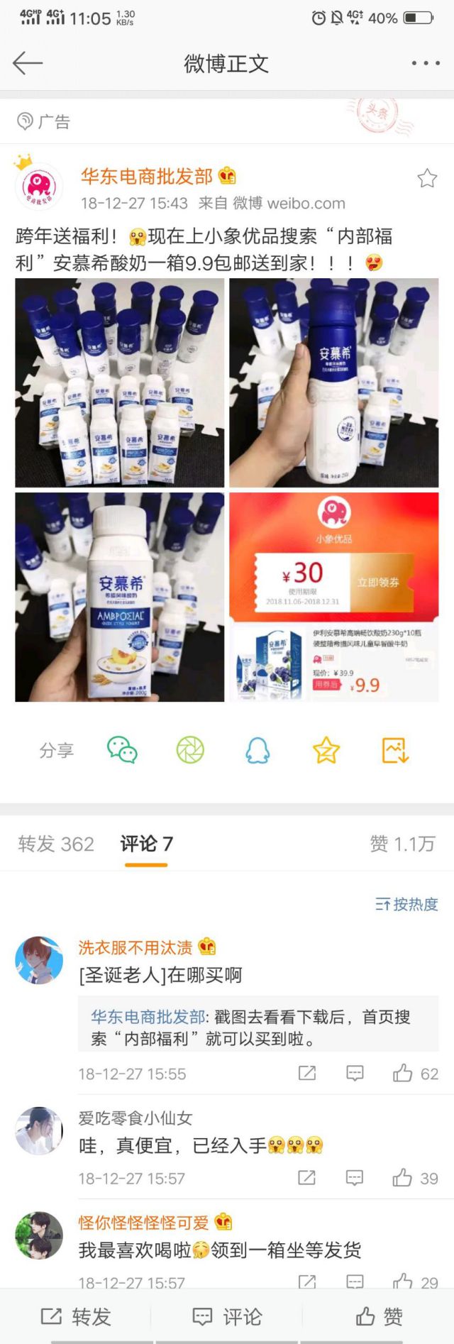 我们都知道,安慕希的价格一般在50——70元之间一箱,而广告中只需要9.9元就可以买到一箱,并且还包邮,使用这种落差大的对比更能吸引用户的点击。 点击进去广告之后,可以看到一些网友的评论,加上广告主的互动,验证广告的真实性,提高用户对广告优惠的信任度,从而促进转化。