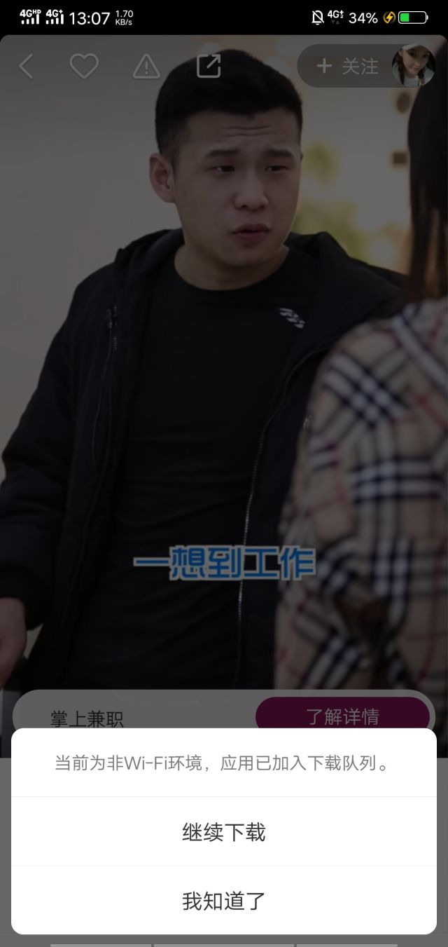 点击进去视频就会自动播放,点击“了解详情”按钮,直接会自动下载,如果用的网络是4G,会有对用户的提醒,如果是WiFi状态下,会自动下载。如此方便,为广告主带来了不少的下载量。