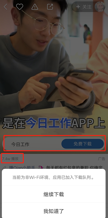 快手广告可以增加个性封面,封面上可以添加一些文字信息,相当于广告文案,广告的封面图特意将微信钱包余额放大,吸引用户注意力,再添加上文字说明,提起用户的“胃”。 快手的用户群体比较年轻化,70%都是90后,87%是80后,而且分布的城市大多是二三线城市,农村和城市的用户相对都很多,而且80——90这个年龄段是求职的高峰期,在快手上投放,也是一个不错的选择。 点击进入到广告之后,视频就会自动播放啦,如果用户看了广告之后感兴趣,可以点击“免费下载”按钮,就可以直接添加到用户的下载列表啦,WiFi用户下的用户会直接下载安装,4G网络环境下的用户会有一个小的提示,避免用户的流量超支。