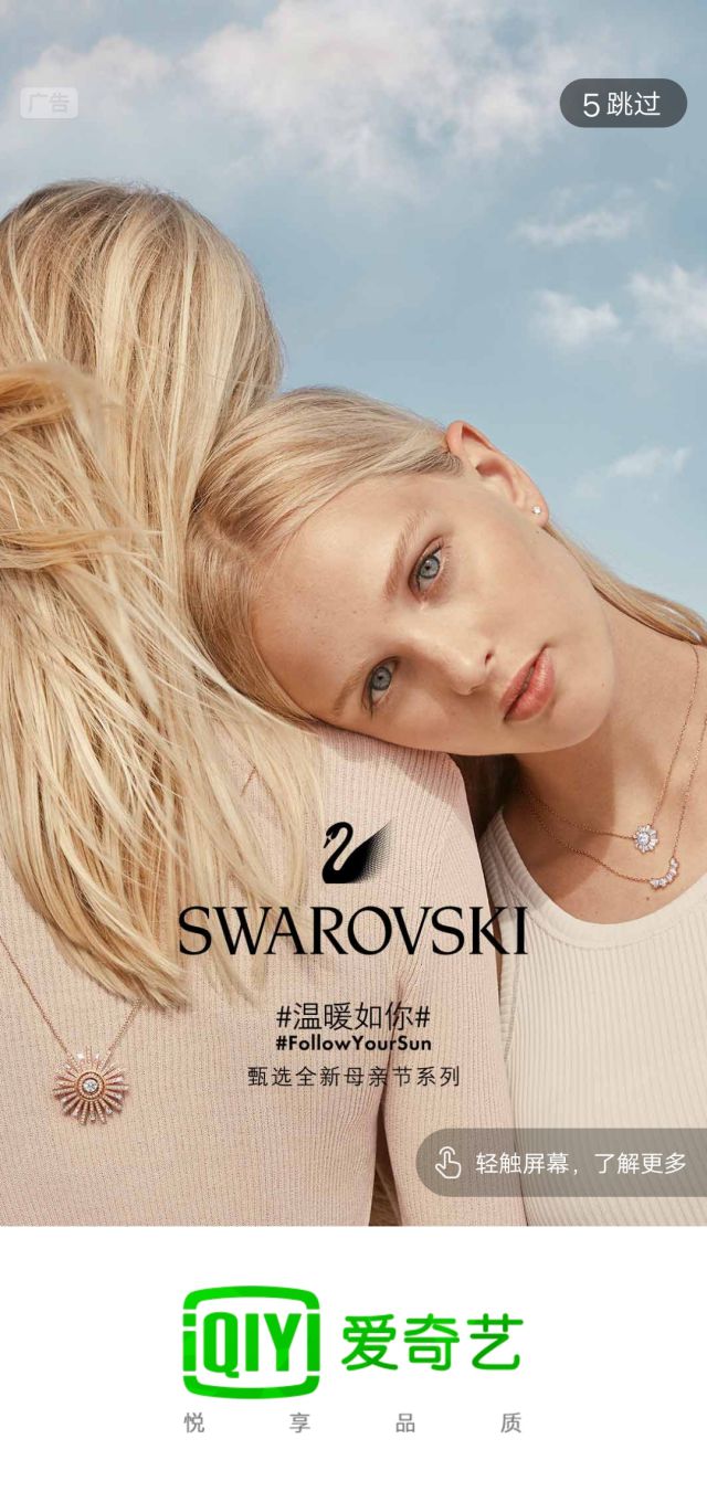 说到是施华洛世奇就想到了黑天鹅的项链,特别喜欢,不知道有多少人有同感。施华洛世奇最出名的不是水晶,而是它的切割工艺和设计,施华洛世奇一放的电视广告很少,一般都是赞助明星参加什么晚会的视频,或者是上一些时尚杂志,自从信做口碑营销息流广告流行之后,施华洛世奇开始转移视线,投放信息流广告,之前在微信朋友圈广告中看到施华洛世奇,今天打开爱奇艺APP的时候,看到了施华洛世奇投放的爱奇艺开屏广告,五一还没过,施华洛世奇广告主就开始为母亲节做准备了,可谓是打开母亲节的第一炮啊。 一起来看广告案例吧,看看有什么新品,最重要的是看看广告创意有什么可以借鉴的地方。