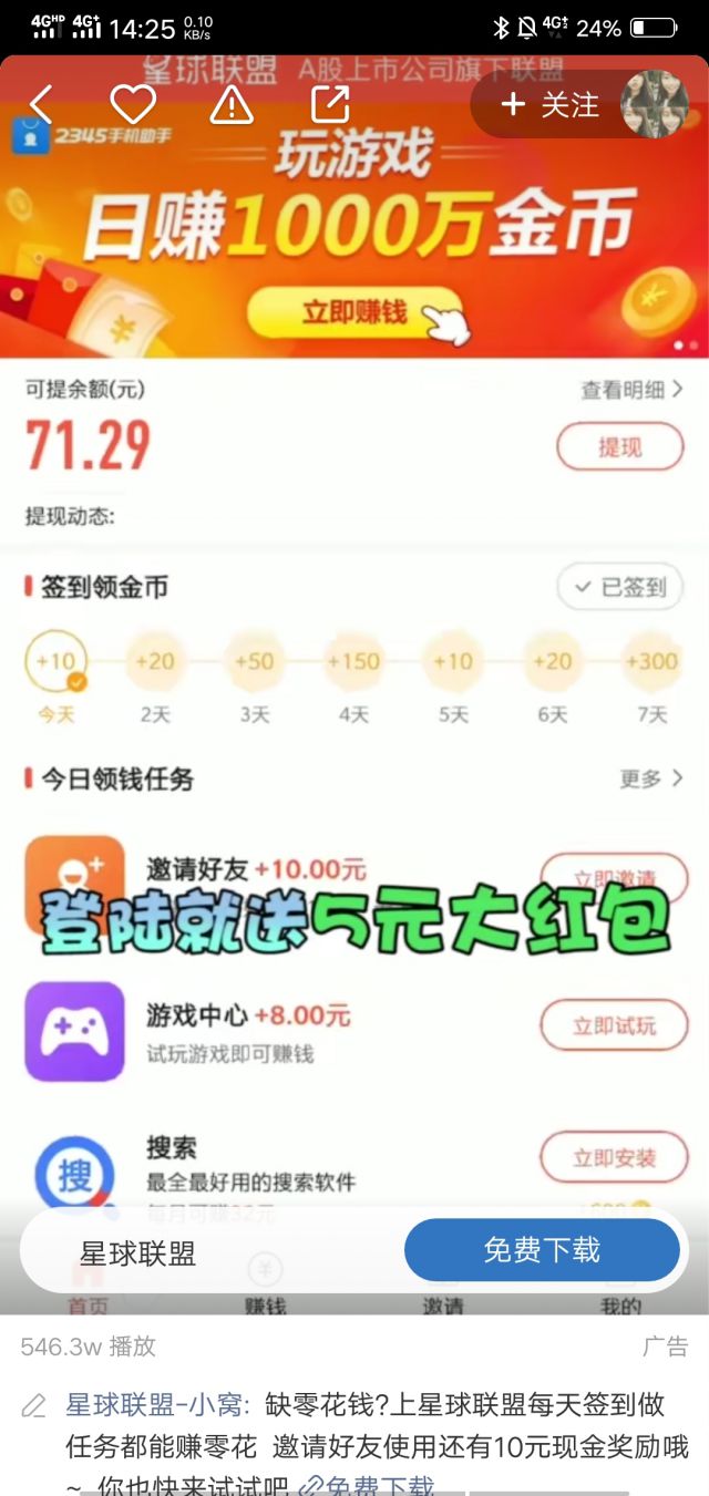 星球联盟是国内最大的线下技术员联盟–2345王牌联盟升级而来。星球联盟是一款安装使用,阅读文章,分享收益的app,同时还融入了区块链概念,注册星球联盟,就送5元可提现资金,推广一个好友可赚6元,下载使用里面的app每天都可以赚钱,阅读文章、分享收益、每日签到等等都是可以赚钱的。 生活节奏越来越快,看电视的时间越来越少,世界也越来越碎片化,如果有一款APP,可以让你利用碎片化时间也能赚到零花钱你愿意试试吗?星球联盟就是一个这样的平台,我也是在快手广告看到的,分享给大家星球联盟的广告案例吧~