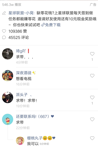 这条广告扥评论达到45525条评论,而且用户的评论都不错,可见星球联盟的口碑很好,深受用户的欢迎,的播放量更诱人,达到了546.3万次,一个庞大的数字。 投放在平台的信息流广告,以视频的形式展现,跟其他热门视频展现形式一样,让广告更自然的出现在用户的视野中什么视频广告比较少。