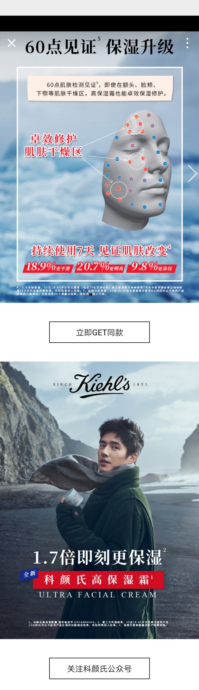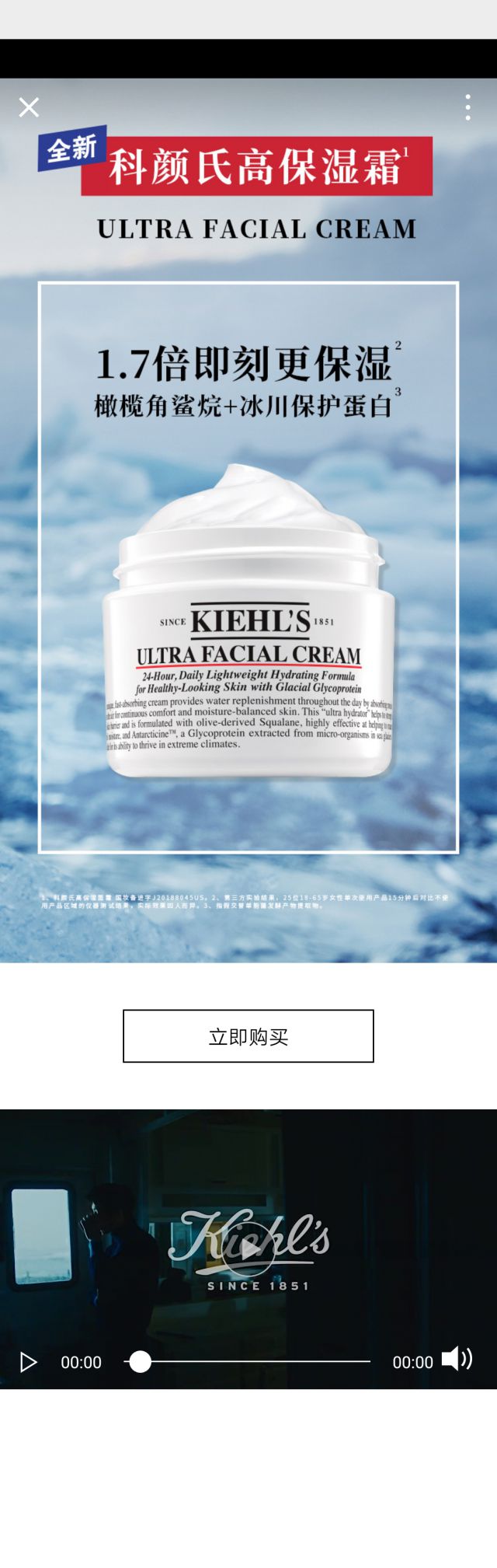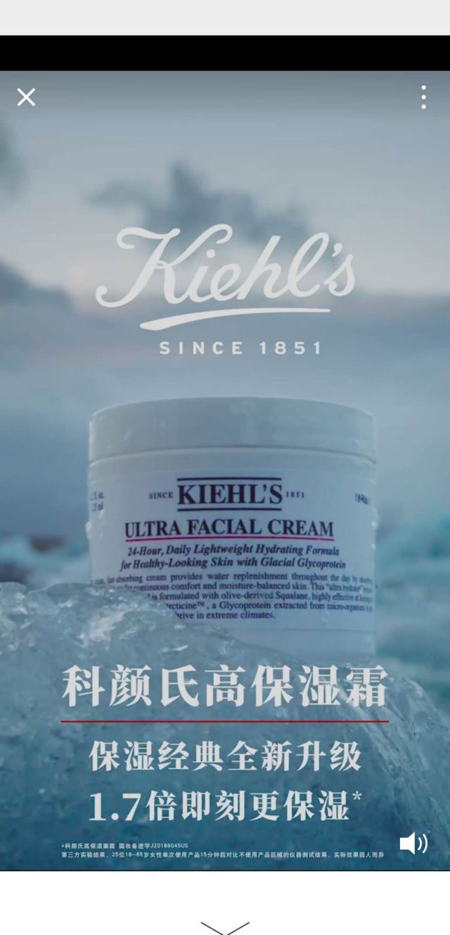 先是一个全屏的视频,视频中展现了科颜氏高保湿霜所含成分以及功效等等,这里展现的内容就是产品经过全新升级后,产品拥有1.7倍即刻更保湿。