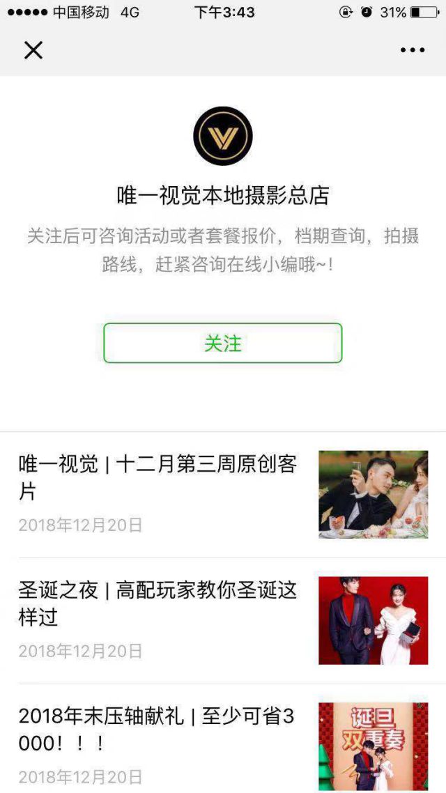 唯一视觉应该是大家比较熟悉的婚纱摄影公司,唯一视觉主要给大家提供的服务就是婚纱照拍摄等等。 广告图片就是唯一视觉的拍摄成片,看着广告图片会发现唯一视觉的广告图片是真的很好看! 广告文案直接讲述唯一视觉的婚纱照服务特点:小贵而精致。也正因为这一特点,所以唯一视觉的也是大多数年轻人的选择! 并且广告文案也有表明这支广告是有区域限制的,仅仅是把广告投放给上海、杭州地区的用户,并且用户点击广告以后,还能够获取2019年婚纱照价目表!