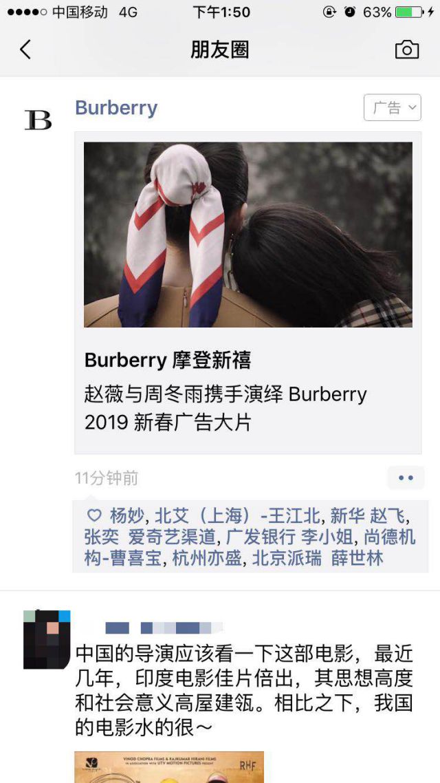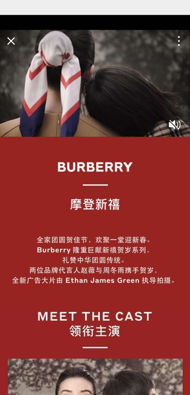 Burberry一代奢侈品中的王者,它做的你有关注过吗?今天小编来跟大家分享Burberry投放的微信!卫视广告 今天Burberry投放的广告出现在我的微信朋友圈广告,跟Burberry一起出现的还有女生赵薇和周冬雨。讲真,一开始看广告,我是真的没太看出来,特别是赵薇。