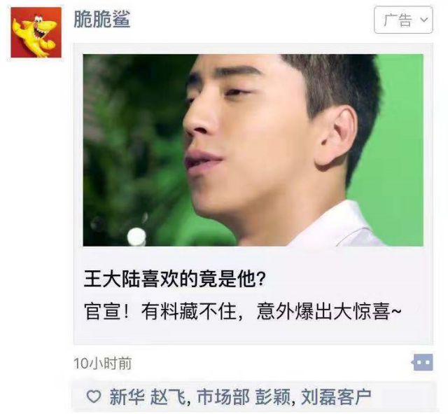 雀巢咖啡推出雀巢脆脆鲨夹心巧克力牛奶花生威化饼干,跟我们小时候吃的那种差不多,脆脆鲨有两种口味可供大家选择,一种是巧克力味平台推广软文哪个好,还有一种就是花生味的。 雀巢脆脆鲨夹心巧克力花生威化饼干在各大超市里都有售卖,今天小编在微信朋友圈广告里看到了它的广告,并且还有他的代言人,王大陆! 广告外层文案如图所示: