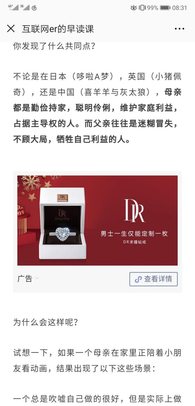 广告是存在公众号文字内容中间的广告,并带有“广告”字样。 DR直接从广告图片和文案中突出了自己与众不同的特点。如“男士一生仅能定制一枚” 如果大家想要了解DR钻戒更多的内容就需要点击广告位的任意位置,就会跳转至DR的微信商城/小程序。 如果大家想要投放微信公众号文中广告时,也可以把品牌/产品的优势和卖点单独拿出来描述,广告落地页就可以是企业的微信商城/小程序! 二、广告落地页