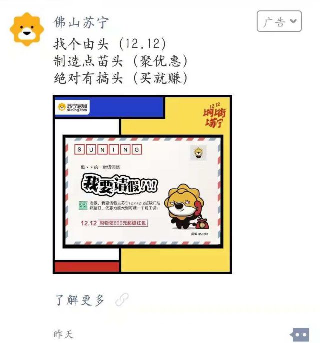 因为微信朋友圈广告是可以根据区域划分来投放广告的,并且全国各地的苏宁也不少,所以这次投放广告的广告主是广东佛山的苏宁。并且广告的投放区域也是在广东佛山,只要用户常用所在地在广东佛山,并且对苏宁有潜在意向的用户才能看到广告! 这次广告主的推广目标就是提前做双十二营销,让更多的目标用户在双十二这天积极参与营销活动并进行产品购买等等。 这次广告幼儿园 危机公关 疾病最大的亮点就是聚优惠和买就赚! 就连广告图片都是请假信,要在双十二这天请假过节。去苏宁12.7-12.12超级门店疯抢日! 在双十二佛山苏宁营销活动期间,到底有什么优惠活动呢? 1.营销活动期间产生购买。优惠力度大到一个月工资,买的产品越多,优惠力度也就越大哟~ 2.双十二这天购物就可以领取860元超级红包! 这就是佛山苏宁外层广告所展现的内容~ 点击广告以后,进入的页面就是佛山苏宁的微信商场和活动主会场,大家有喜欢的产品就可以直接购买了哟~ 讲真的,如果我有购买需求,并且优惠力度超大的时候,我也会去购买的! 这就是佛山苏宁的微信朋友圈广告,如果你要投放微信朋友圈广告,要推广自己的营销addwords活动,会选择怎么做呢?