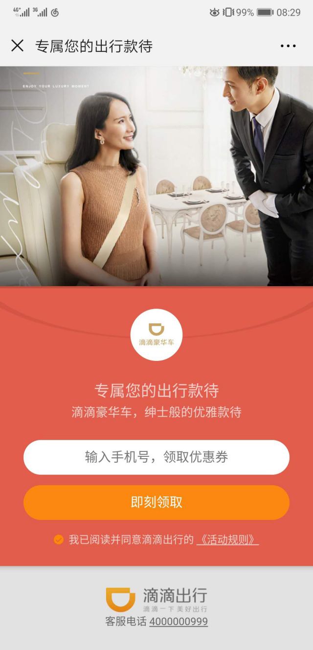 要领代运营方案取优惠券,还请大家填写联系方式,领取优惠券,领券结束后,大家有使用滴滴出行就可以使用优惠券咯~ 如果大家对于滴滴豪华服务号想有更多了解,也可以关注企业的官方公众号~