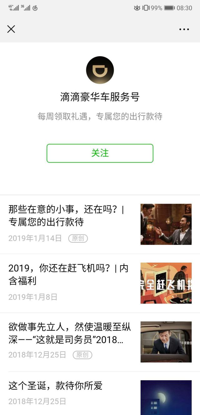 相信大家对滴滴出行并不陌生,当我们通过微信来进行打车服务时,都是通过滴滴出行来进行的,相信大家应该都或多或少的有使用过。使用滴滴出行打车时,需要先定位自己的地址然后到达地址,随后就会有司机到达指定地址啦! 今天小编要跟大家分享的广告案例就是弟弟豪华服务号投放的微信,我们一起来看看吧?