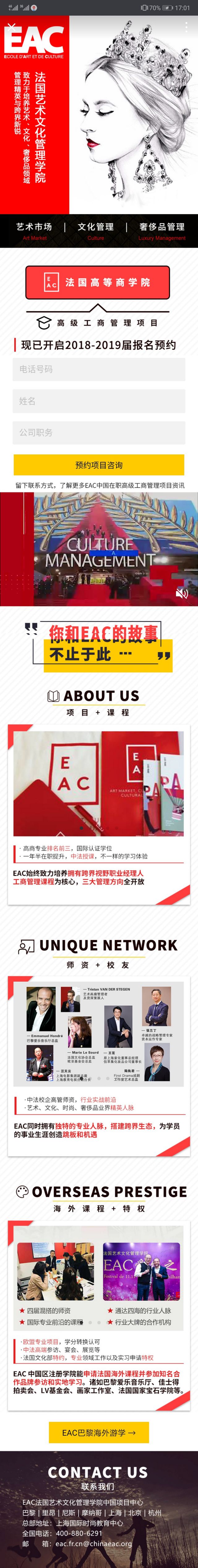 大家既然点击广告,就证明肯定是对高级危机公关处理分析ppt工商管理项目是有兴趣的,既然有兴趣那就赶紧填写联系方式,填写以后会有更快照优化排名多EAC中国在职高级工商管理项目资讯! 在没有对学校介绍之前,大家肯定没有那么冲动,所以在落地页中,还是有很多关于EAC的内容。 比如EAC目前可提供的项目+课程,师资+校友,海外课程+特权,这些内容都是品牌在做信任背书,通过信任背书来吸引更多的目标昭通市网站建设用户,通过信任背书来激发用户的关注欲。 在落地页中还有按钮“EAC巴黎海外游学”,点击以后就会进入企业微信公众号的内容页,可以观看别人正在参与项目的学员的真实案例。广告主通过广告案例来跟大家讲述参与项目的好处和优势,并以此来吸引用户在线咨询或是填写联系方式。
