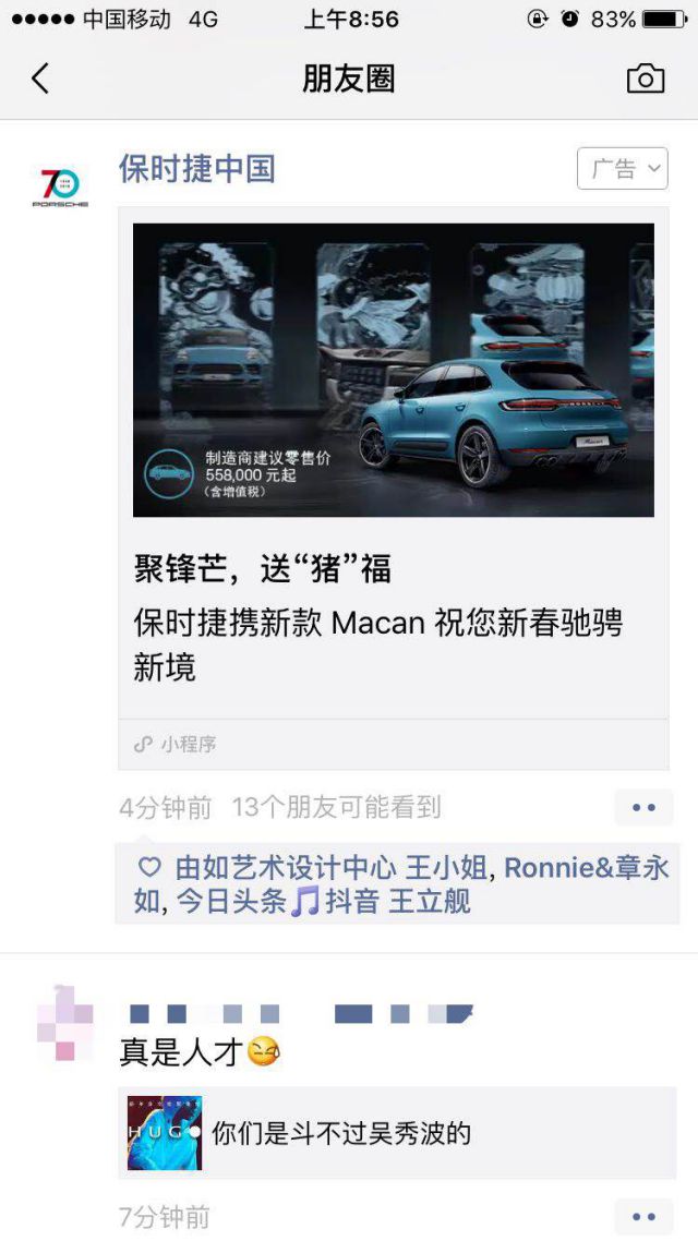 小提示:您应该对本页介绍的“保时捷携新款Macan在微信朋友圈送“猪”福”相关内容感兴趣,若您有相关需求欢迎拨打我们的服务热线或留言咨询,我们尽快与您联系沟通保时捷携新款Macan在微信朋友圈送“猪”福的相关事宜。