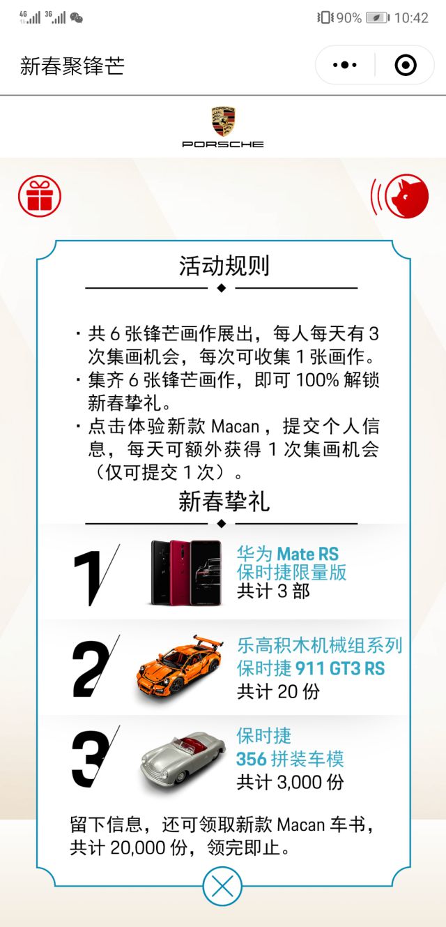 活动还是真吸超链接引人滴,活动就是集画,集齐6张即可召唤新春挚礼,这里的礼品就算是华为Mate RS(保时捷限量版)、乐高积木机械组系列和保时捷356拼装车模等等。当然大家也可以填写自己的联系方式可以领取Macan车书。 点击关闭按钮,我们接着看广告!