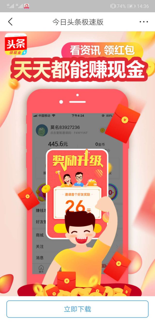 首先看资讯赚钱不是我说滴,是人家广告主自己说的,再次证明今日头条极速版可以看资讯赚钱的真实性。 既然要赚钱,放APP的内容页显然是没有太大效用的,还不如像广告主一样,直接放到账信息截图就好啦! 广告主的推广目标是APP下载,所以我们点击广告以后可能是进2019年个人危机公关案入APP下载页。 为了证明小编的猜测没错,就是只能点击广告看看咯~