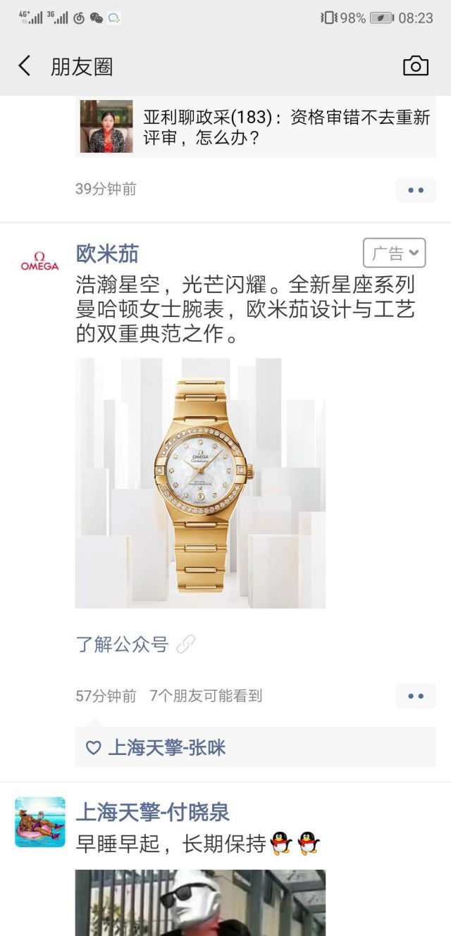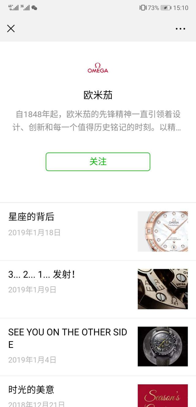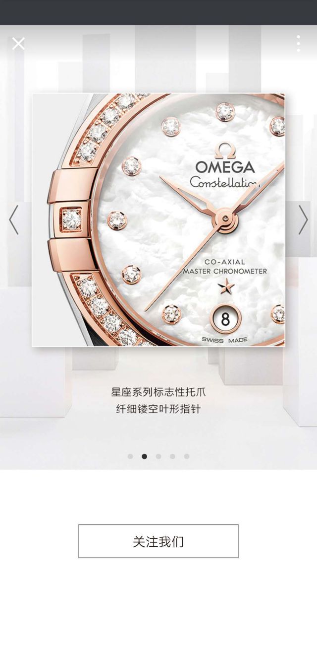 在这一页我最关注的除了腕表细节以外,还会关注这一页的按钮“关注我们”,点击以后就会进入公众号关注页面! 关注公众号的目的可以了解品牌最新详情,也可以直接购买产品。 这就是聚美优品失败的危机公关案欧米伽的微信朋友圈广告啦!