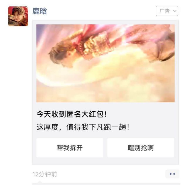 呐,这里的广告主名称、头像包括视频主角都是鹿晗哟,这应该是鹿晗粉们最喜欢的微信朋友圈广告啦! 呐,鹿晗收到匿名大红包,而且大红包厚度不错还引得鹿晗下凡! 广告主是有运用鹿晗的明星效应的,所以在这里添加两个按钮“帮我拆开”和“嘿别抢呀”,希望用户和广告主能够取得联系。 点击广告以后,进入页面如下: