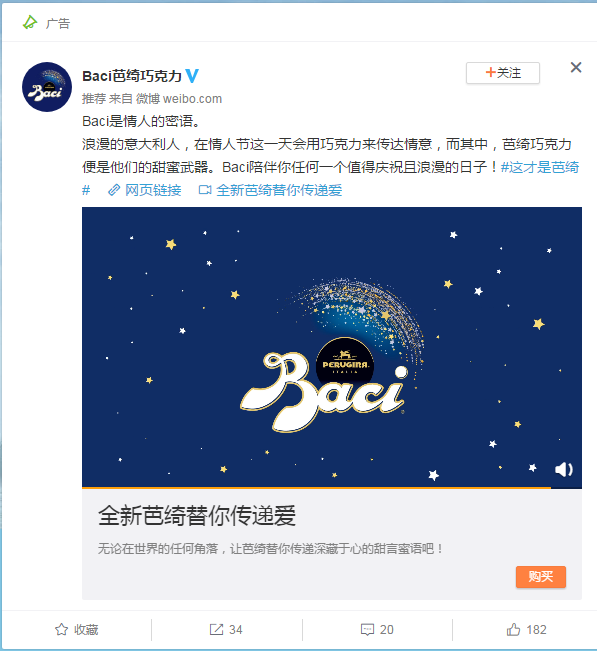 选择的广告资源是:微博信息流广告 广告主的推广目标:品牌曝光+订单转化 广告文案:文案就是在市宣传片直接表明在情人节和表达爱意中,最合适的惊喜就是巧克力,并且巧克力也是情人之间的私言蜜语,巧克力也是情人之间的助力。一开始情人节只是在西方流行,在我们国家,情人节也是同样的流行,并且和爱人在一奔驰 危机公关起的情人节更值得庆祝浪漫,而芭绮巧克力就是两个人之间的甜蜜武器。 广告视频内容:广告视频内容就是在不同情况下,芭绮教你如何表达爱意,在表达爱意的同时,广告主也向广大用户展现自己的巧克力制作过程! 广告内容分析: 在情人节前期,做借势营销之前,我们需要提前先找到一个合适的广告代理商,并进行微博粉丝通广告合作,提前做好开户准备,并提前和广告优化师商定好情人节营销活动玩法。 品牌在做情人节之前,需要找准产品的出发点,并找到目标受众的关注点,从这两集中出发撰写的广告文案会更轻易把握用户情感,并让广告的推广效果达到最佳! 广告落地页:点击广告以后,我们就会进入广告主的推广链接之中,广告主的推广链接是京东旗舰店店铺详情,这一做法,会更轻易让用户立即产生购买行为!