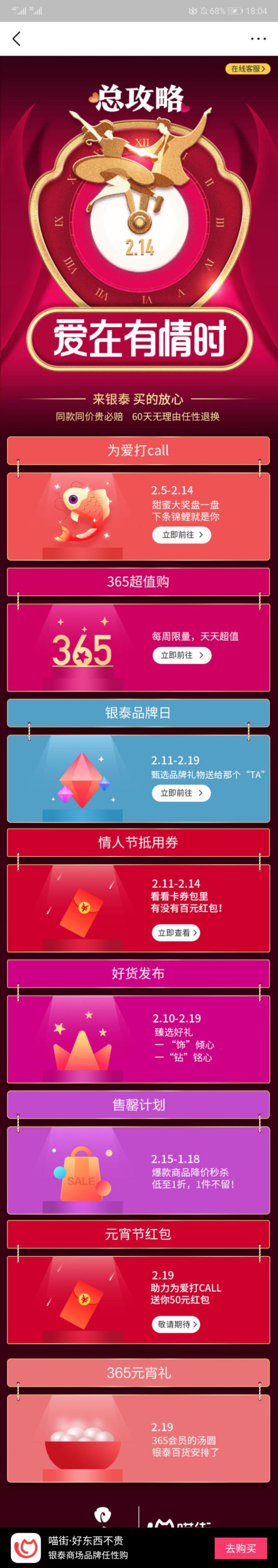 广告文案: 2018年最火的锦鲤在现,银泰集团通过锦鲤来吸引用户关注我们的广告活动,并以此来吸引大多数用户关注,让更多的目标用户愿意了解我们的广告。 广告图片:广告图片是品牌广告主为了情人节专门做的营销海报! 广告落地页: