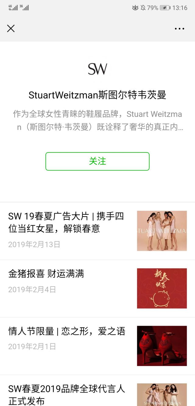 点击广告页面以后就是清一色的小姐姐大长腿,讲真海底捞危机公关 时间的,还是杨幂的大长腿最亮! 这次广告主是宣传自己的春夏广告大片,并且邀请的代言人可是名响全球,比如杨幂,Kendall jenner,Willow Smith,Jean Campbell。 广告大片北京以及代言人服饰的背景色大多是以裸色为主色调,也更能突出品牌的核心价值~更多品牌相关内容尽在途中,大家可以仔细观看下哟~ 春季还没正式到来,所以广告主大片也只是做品牌宣传的作用,所以在广告落地页中有添加按钮“点击关注官方公众号”,用户点击按钮以后,就可以直接进入微信公众号的关注页面。