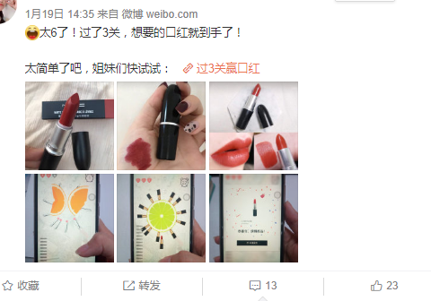 第二支广告是图文形式的,游戏只要闯过三关,即可获得大牌口红。并且图片中的口红,都是真人体验,并且还有游戏试玩过程! 广告文案仅说,过三关,想要的口红就到手,会更容易刺激用户的求知欲,到底是玩什么,能够做到只要闯三关就可以拿口红啦! 这就是小编想要跟大家分享的线上口红机游戏投放微博粉丝通广告案例,广告主待认领哈哈哈
