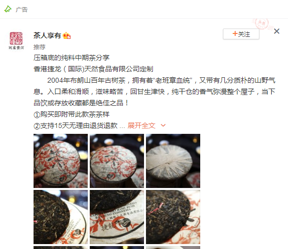广告主是通过微精准营销大数据获客博粉丝通广告的信息流广告资源位来推广自己的微博账号。 并且还通过广告来向大家呈现公司品牌,推广产品的信息(通过文字讲述茶叶口感,通过图片来跟用户展现茶叶形象)。看完茶叶相关的文案创意后,大家对茶叶很感兴趣的话,是可以通过点击广告链接来进行茶叶购买的,在这里品牌也做出了承诺,比如购买会附有茶样,15天内无理由退货退款等等。这些内容均是在给用户做信任背书! 在通过微博粉丝通广告推广自己的微博账号时,应该注意哪些内容? 1.广告文案是否能够打动人心; 2.广告文案是否营销推广能够明确给用户提供明确的服务,广告投放以后能否让用户看到广告文案以后就能懂得广告主想要表达的内容; 3.广告图片是否清晰,是否和文案有一致性; 4.用户体验是否流畅等等。