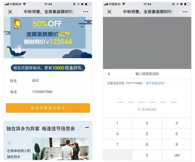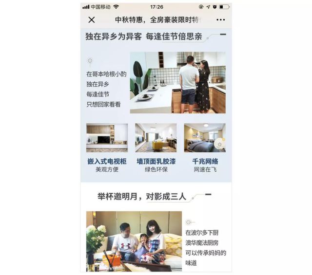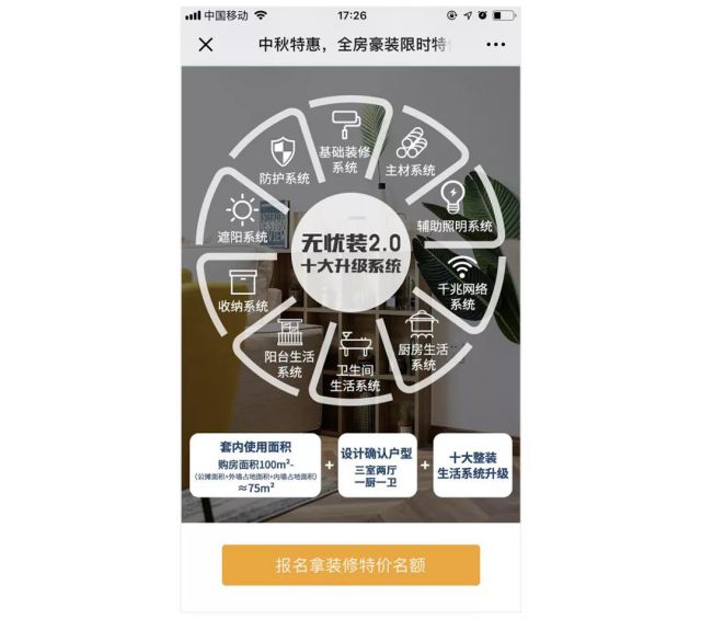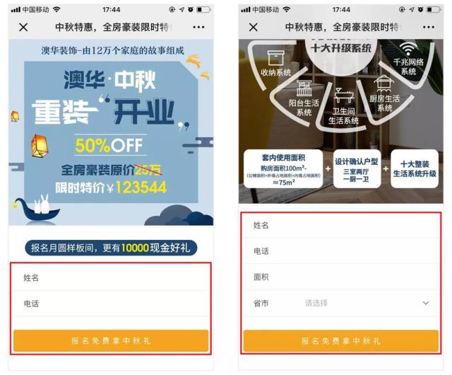 “直击痛点”,是指澳华装饰配合限时特价让利、中秋节假日等营销活动进行落地页设计,正面回应消费者在装修各个环节中的痛点、难点,消除消费者的疑虑,从而获得比报价类型落地页更高质量的表单预约转化。