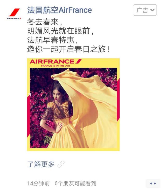 春天来啦,该造作的就要造啦! 今天小编要跟大家分享的广告案例是法国航危机公关新闻发言稿6空的,广告主选择的广告资源是微信! 呐,我们一起来看看法国航空投放的广告案例吧! 一、广告外层文案