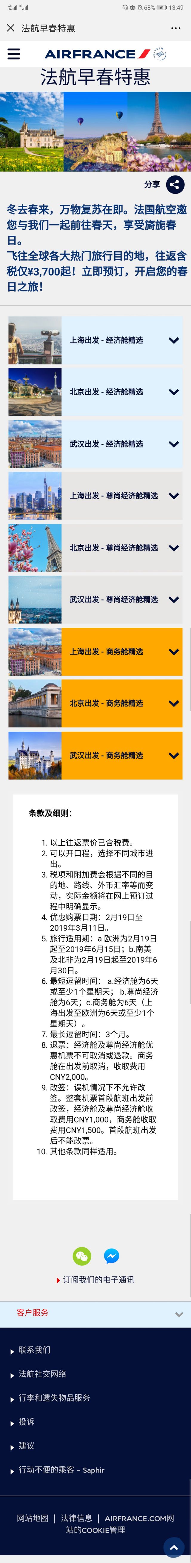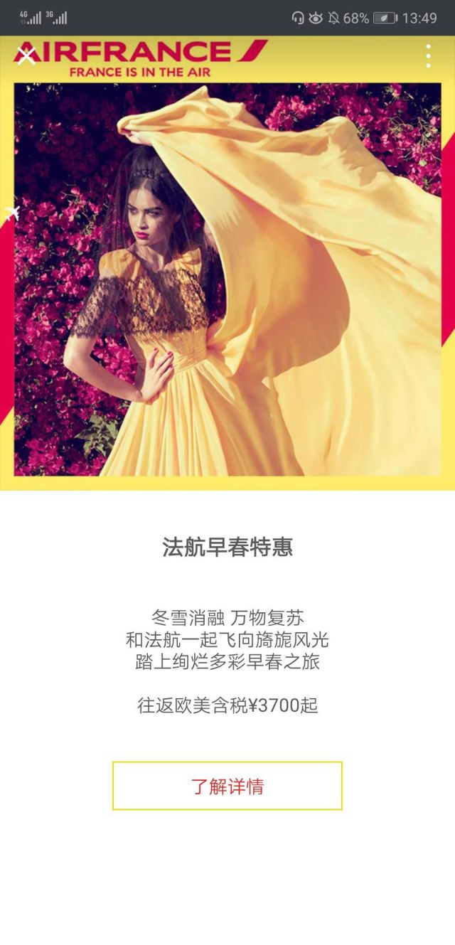 呐,通过这一页我们可以看出法国航空能够给我们提供的服务!这里广告主提供的服务就是“法航早春特惠”! 大多数的用户看到这里,特惠,到底有多优惠呢?这就是我们可以思考的内容啦~ 广告图片配图也展现了法国女人的精致,配图满分! 好啦,我们赶紧点击广告看看吧! 二、广告落地页