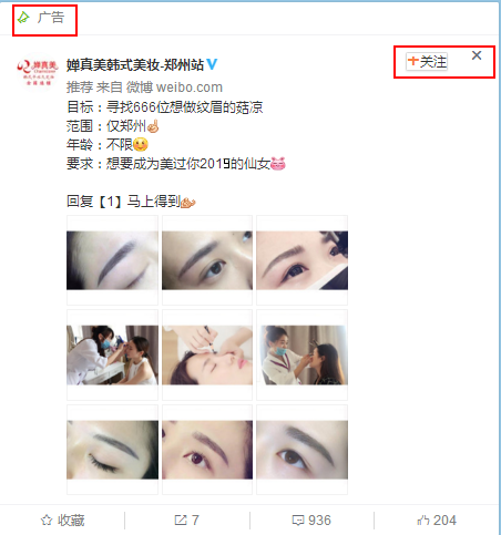 广告主投放微博粉丝通的广告也很有意思哟~ 广告主做的广告投放就是抽奖转发形式,用户通过转发广告主的微博广告图文,即可参与活动。如果有用户免费参与就可以直接到店体验纹眉服务哟。 广告主选择的广告图片就是九宫格的形式,在顶部和尾部的图片就是广告主做好的眉型图片,中间则是开始纹眉古城的图片。也向我们展现了广告能够给我们提供的纹眉服务是怎样的! 广告主做这样的微博粉丝通广告有什么优势呢? 1.让自己的品牌官微有一定的粉丝量增长,可以吸引用户关注我们品牌; 招聘危机公关2.让自己的纹眉服务得到曝光,让更多的用户知道品牌广告主能够提供的服务,让更多的用户如果有纹眉需求,也可以赶紧联系广告主! 在这里小编有个小小的建议,在我们投放微博粉丝通广告时,也可以填写自己店铺的地址和联系方式,这样也不至于会让用户落空!