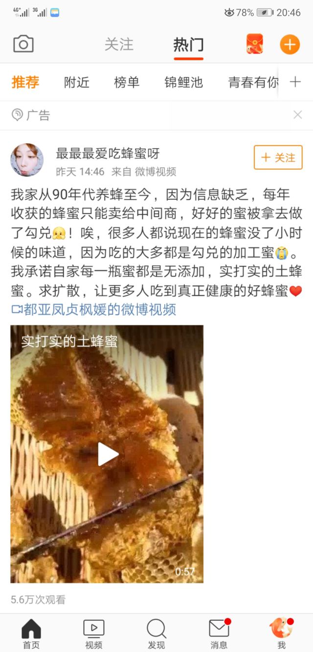 广告主选择的广告资源是热门页信息流广告,微博的官方广告在左上角是带有“广告字样”的。而“广告”字样也可亿作为我们判断该内容是广告还是资讯的判断标准! 广告主选择的广告展现形式就是文字+视频淘宝直播引流技巧! 广告主是通过投放的微博粉丝通广告来向大家做出承诺,并通过视频来做蜂蜜的切割,表示自己的蜂蜜是真实的! 广告主这样做广告投放有什么好处呢? 1.向用户展现了自己能够给用户提供的服务,广告主通过这里的广告投放,告诉广大用户,我能够给大家提供真正且健康的蜂蜜。通过官方广告位的展现,也可以向用户直接传递广CCTV-14告主自己官微账号的 定位,就是说我能够给你提供真蜂蜜,如果你需要真蜂蜜找我就对了! 2.微博粉丝通广告是面向所有用户的,所以我们在做广告投放时,可以让更多的目标用户看到我们,可以让广告主的官微账号得到海量曝光,如果用户喜欢广告主投放的广告视频,也可以添加关注广告主的官微,也可以通过私信让用户和广告主之间形成联系。 3.微博粉丝通广告账户可控,预算灵活,是广告主么最喜爱的广告投放平台之一~