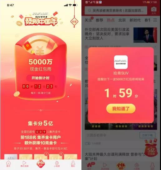 伴随着移动互联网时代商业化的快速发展,线上红包已经成为当下互联网民春节期间流行的社交方式。 尤其是今年春节期间,各大互联网公司的红包大战也让节日气氛更浓郁。而对于各个平台来说,这场战役的关键是争夺更多流量,这就要求营销玩法不断创新,以吸引更多用户参与。 作为国内SUV领域的领头羊,哈弗一直在营销方面持续探索,把握时代趋势,进行创新实践,并取得不俗成绩。 截止2018年底,哈弗SUV全球累计销量突破500万辆,成为中国首个进入500万俱乐部的专业SUV品牌,并一举创下了连续9年蝉联中国SUV销量第一的记录。 今年春节期间,为品牌营销与推广了庆祝全球销量突破500万辆,哈弗SUV携手今日头条“发财中国年”活动,占位春节营销赛道。 本次活动由哈弗SUV和今日头条共同为用户送福利,两位行业龙头联手献出15亿超级大红包,通过多种有趣的互动玩法,收割了一大波年轻用户的心,哈弗SUV更是斩获了大批高意向的购车人群,可谓实现了销量和品牌的双丰收。