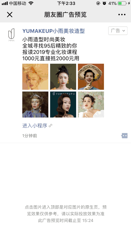 小雨美妆造型是一家集新娘跟妆、造型培训、进修培训等于一广告企业网体的时尚美妆馆,针对广告主对广告投放同时有品宣和课程推广的需求,广告在设计制作及投放上充分满足了广告主的需求。广告外层画面选择6宫格—不同类型妆容的图片为主画面,提升女性用户对广告微信号的兴趣;文案“寻找95后精致的你”圈定年龄段,给目标用户以群体归属感;左下角设置“进入小程序”文字链,方便用户直接点击进入小程序落地转化。