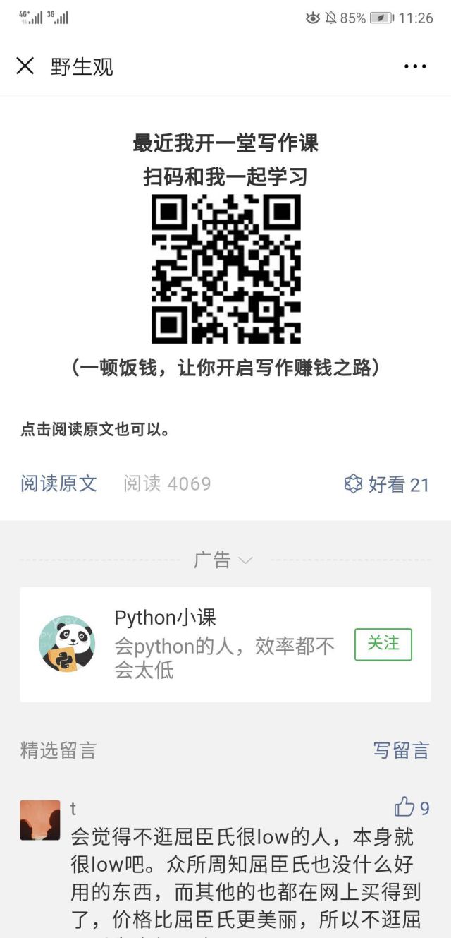 呐,上图就是了! 广告展现的内容不是很多,但是突出了自己的品牌形象,也突出了广告主品牌能够提供的服务。 如果不是行内人,不一定会懂得Python是什么。Python是一种计算机高级编程语言,如果有从事工程师的朋友,就会知道,懂得Python,也能够提升自己的工作效率。 所以广告主这里的广告投放也是以提升工作效率为主,来吸引用户来关注微信公众号滴! 在卡片广告右侧,有“关注”按钮,点击按钮,如果你么有关注过公众号,你看到的页面如下: