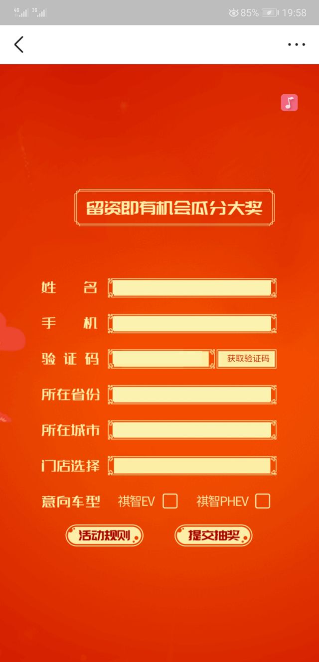 点击以后,我们看到的页面就是这样,我们需要填写自己的姓名、手机、所在城市等等,选择好车型,我们就提交自己的联系方式以后就可以参与抽奖活动啦!