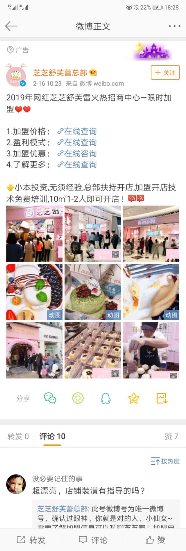 小提示:您应该对本页介绍的“芝芝舒芙蕾的微博粉丝通广告招商加盟广告!”相关内容感兴趣,若您有相关需求欢迎拨打我们的服务热线或留言咨询,我们尽快与您联系沟通芝芝舒芙蕾的微博粉丝通广告招商加盟广告!的相关事宜。
