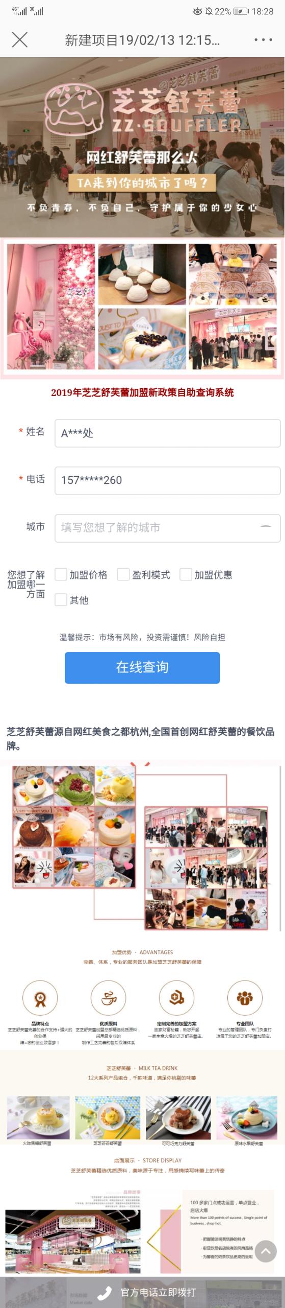 落地页上承载的内容还是比较多。用户还可以填写自己的联系方式,并选择自己想要了解的内容就可以进入2019年芝芝舒芙蕾加盟新政策自主查询系统,并且通过落地页内容我们开可以了解到成功加盟芝芝舒芙蕾以后的经营产品以及软文的推广目标成功案例,当然品牌优势也还是必不可少的,就连店面展示在广告落地页中也是可以直接看到的! 如果客户急于了解,可以赶紧点击屏幕下方的“官方电话立即拨打”,获取自己想要了解的信息哟!