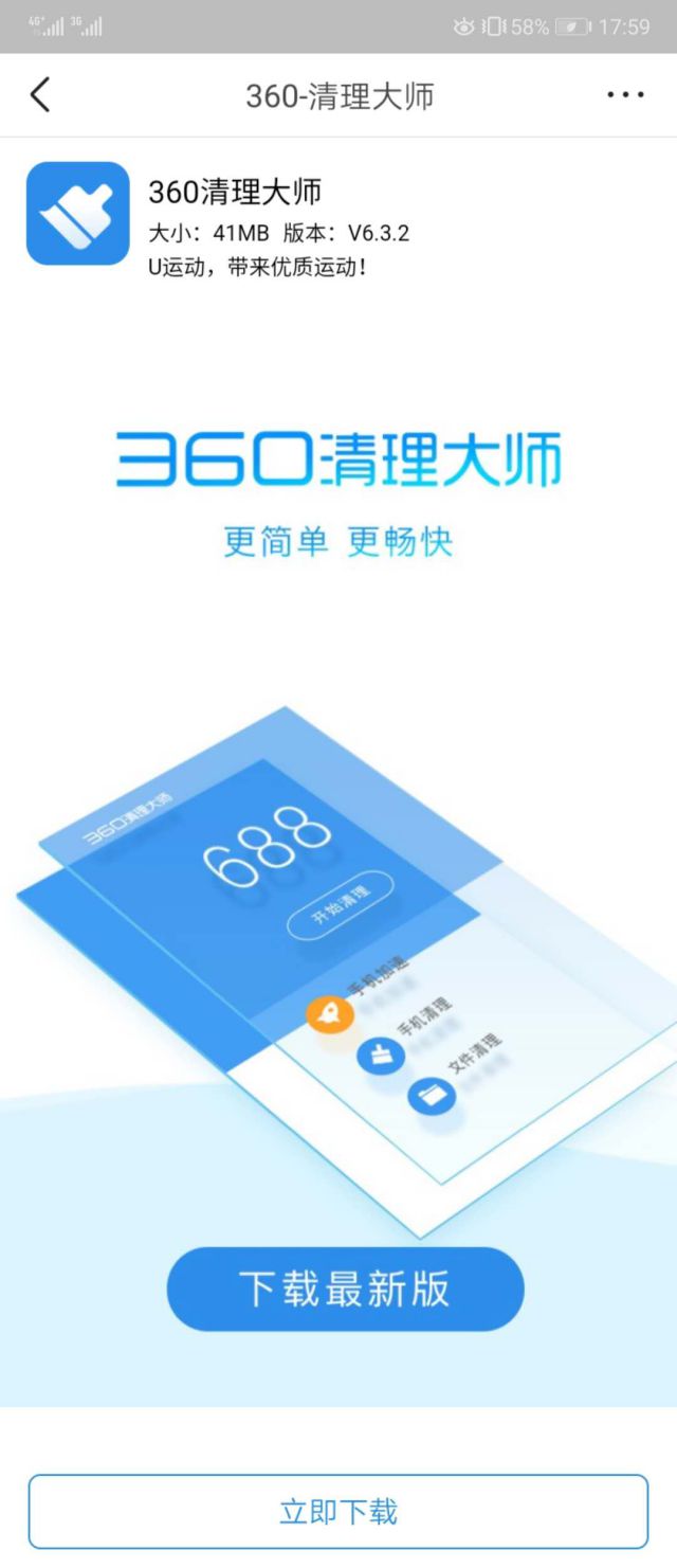 广告主的广告落地页还是比较简单粗暴的,广告主苏州形象宣传片在广告外层文案中讲明了用户可能存在的问题,所以在广告落地页中,就直接解决大家所遇到的问题。 广告落地页直接就是360清理大师的APP下载链接,点击按钮“下载最新版”和“立即下载”都能够直接下载360清理大师,这样既能快速解决软文推广怎样操作用户问题,也能够提升用户对广告的好感度!